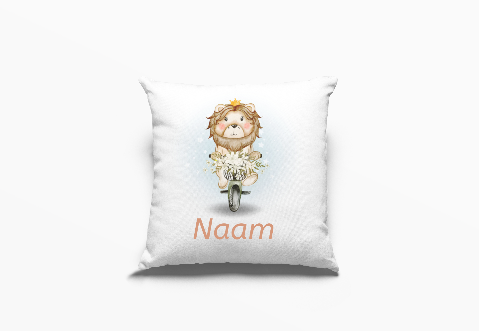 Home » Winkel » Cadeau ideeen » Kussensloop bedrukken » Kussen bedrukken met foto leeuw op fiets en naam