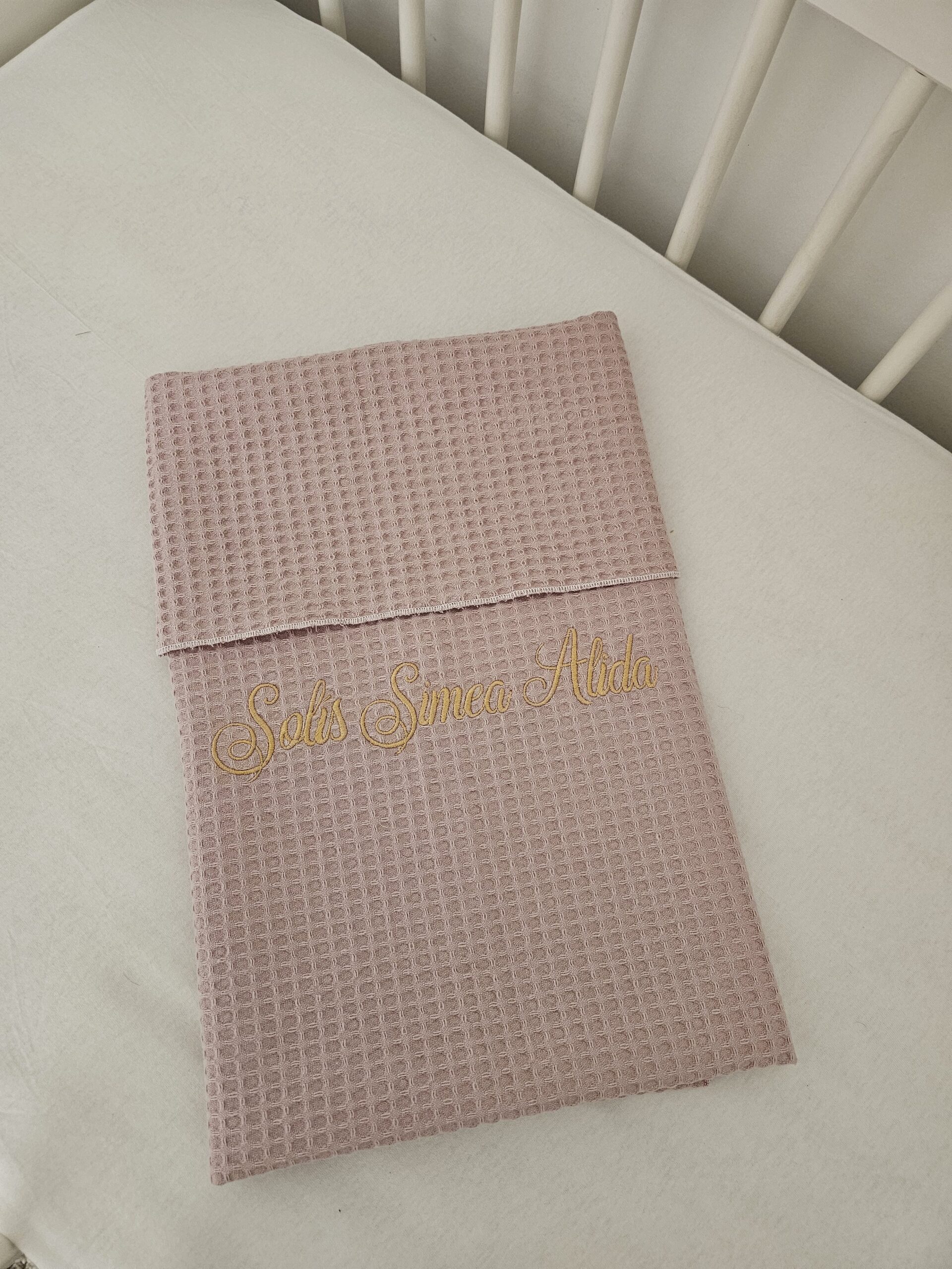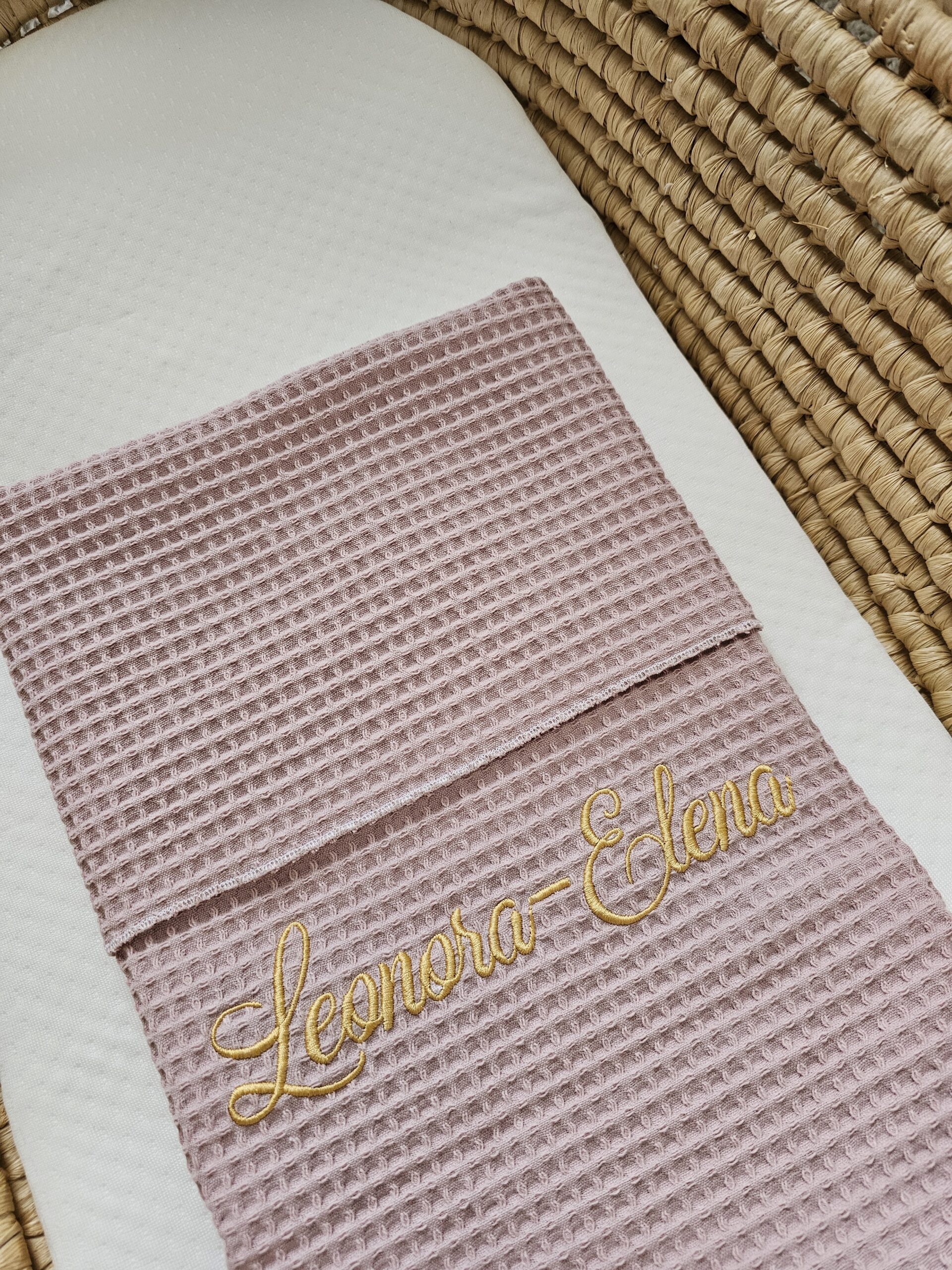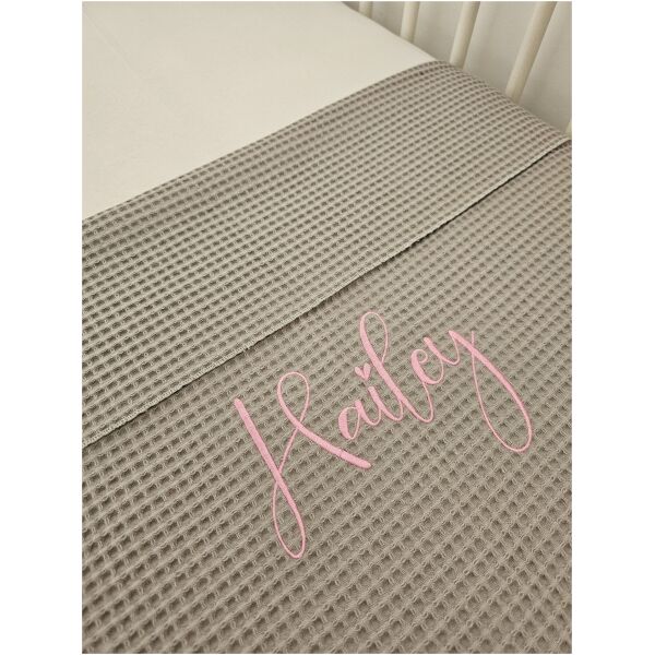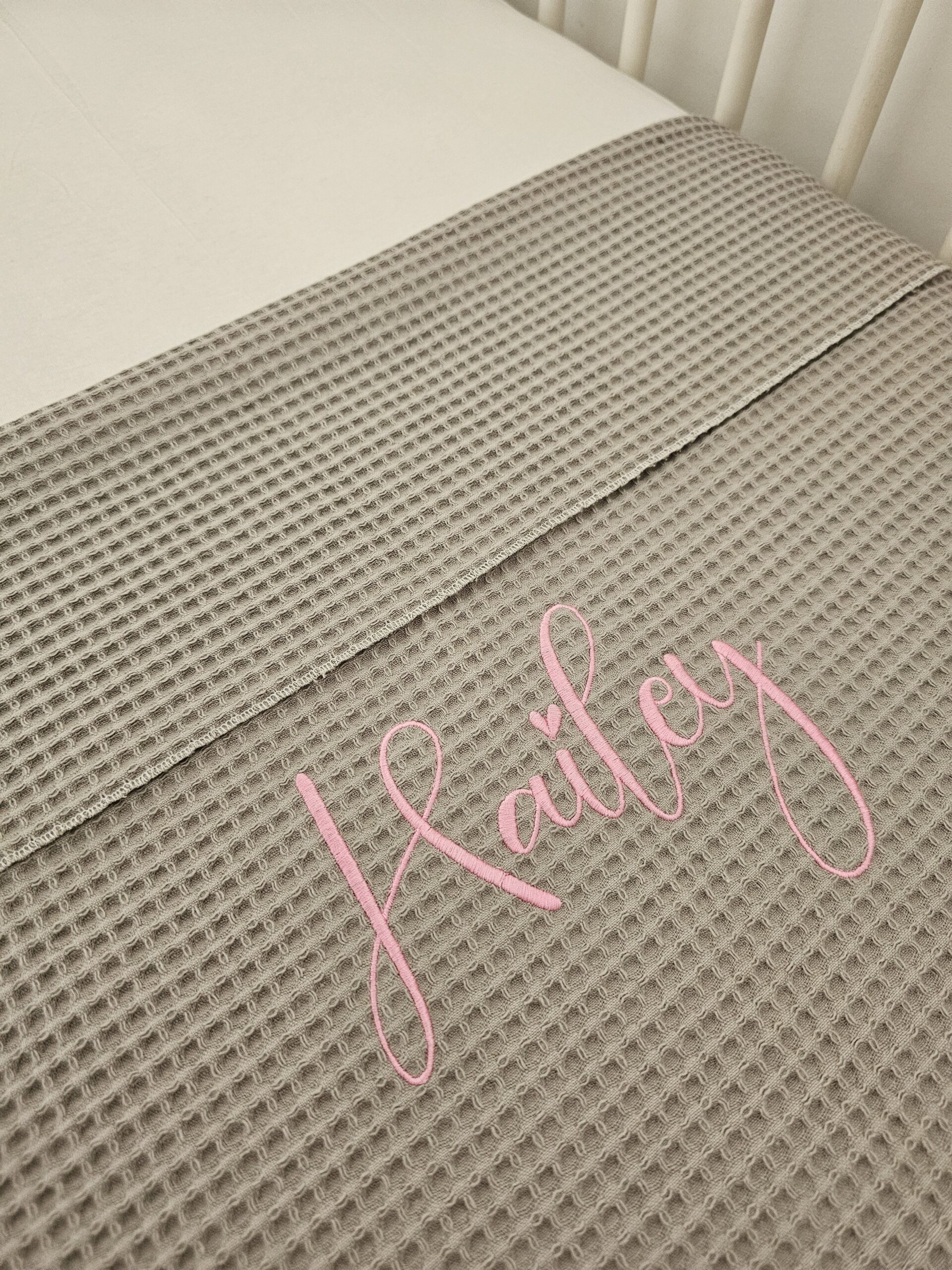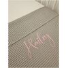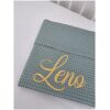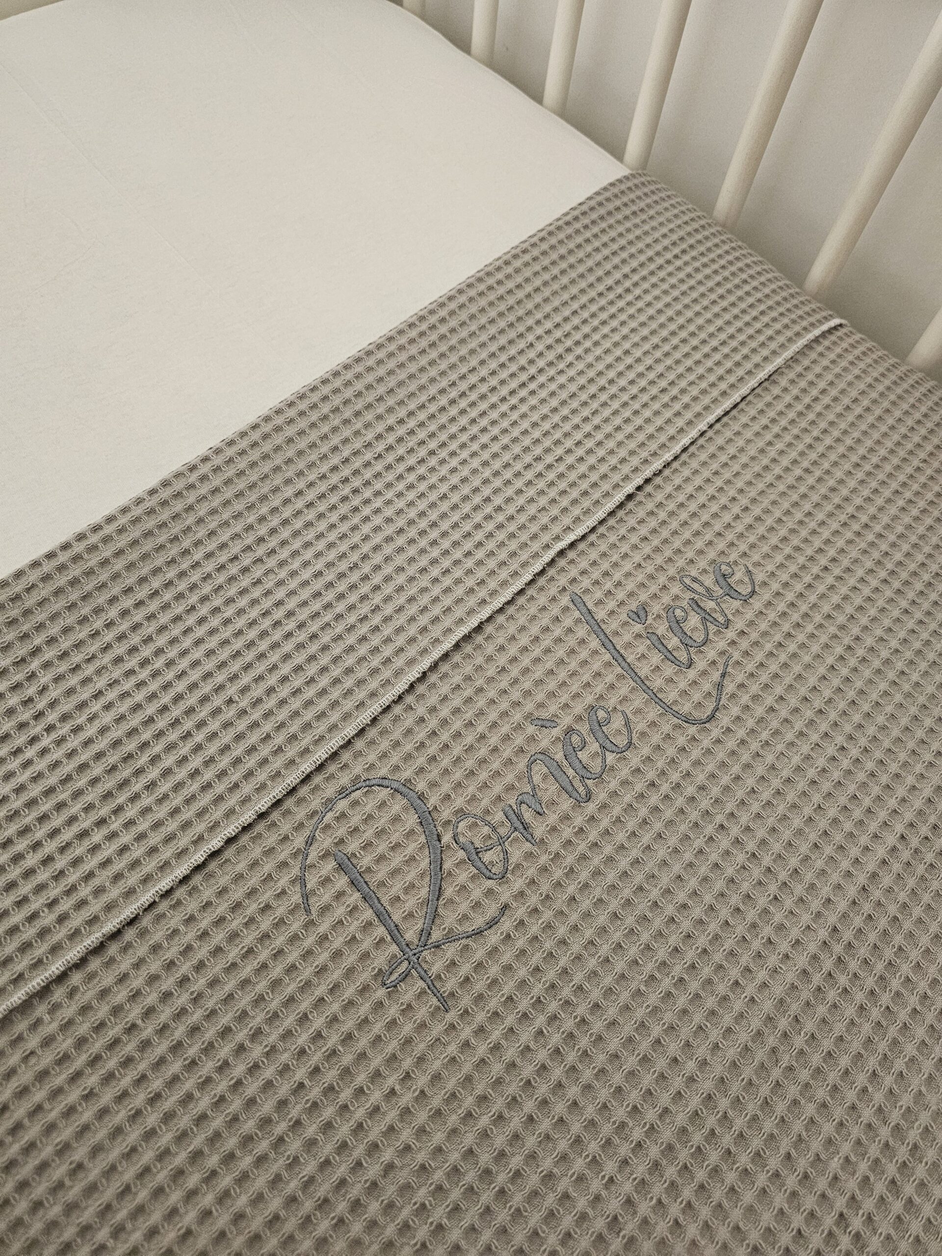 Licht en luchtig wafelkatoen, geborduurd met naam naar keuze. Een uniek en stijlvol kraam cadeau!