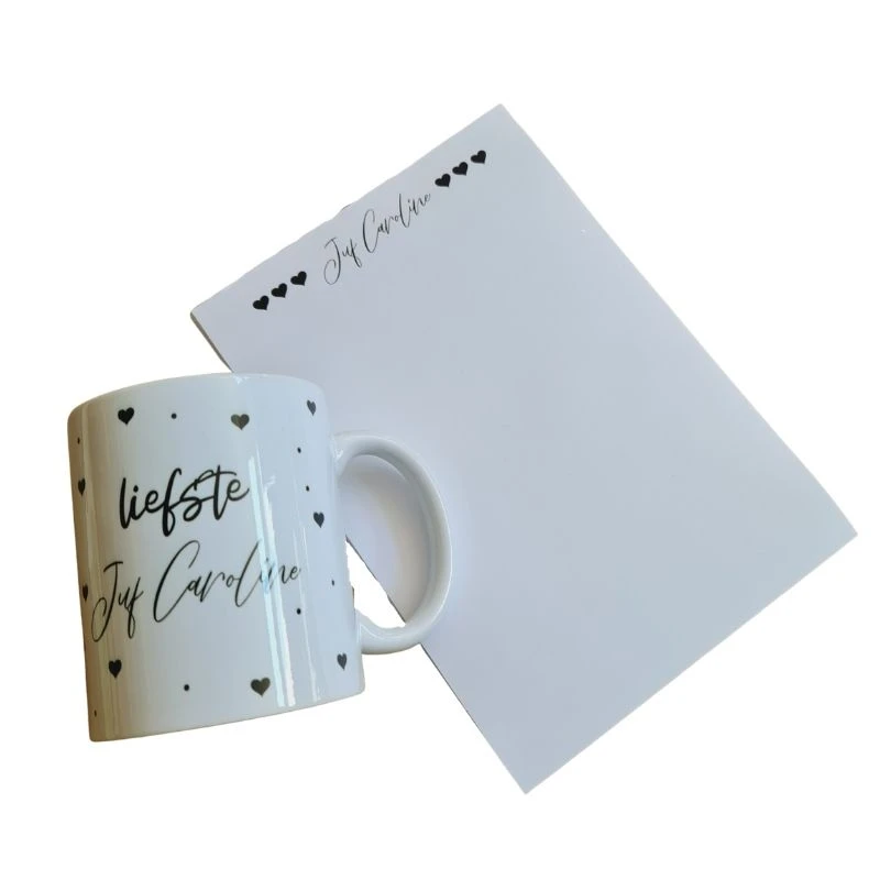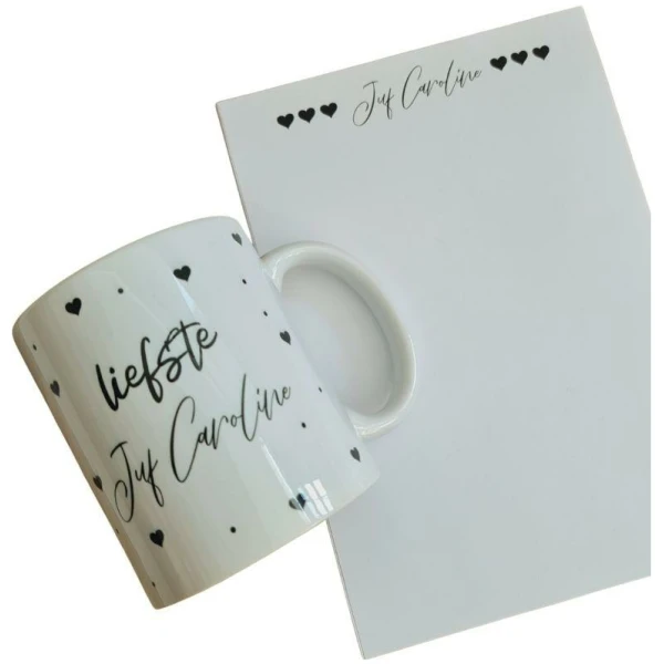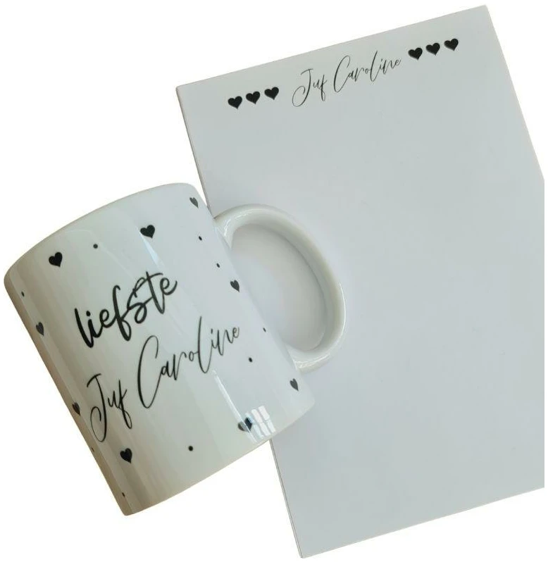 Super leuk cadeautje voor jouw juf! Deze setje bestaat uit een beker 330 ml en een A5 kladblok, allebei gepersonaliseerd met de naam van jullie juf!